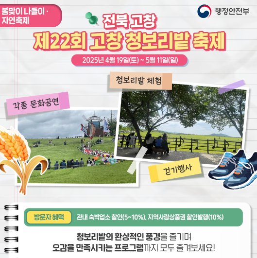 안녕하세요! 오늘은 봄철 최고의 자연 축제 중 하나인 ‘고창 청보리밭 축제’에 대해 알아보려고 해요. 🌾